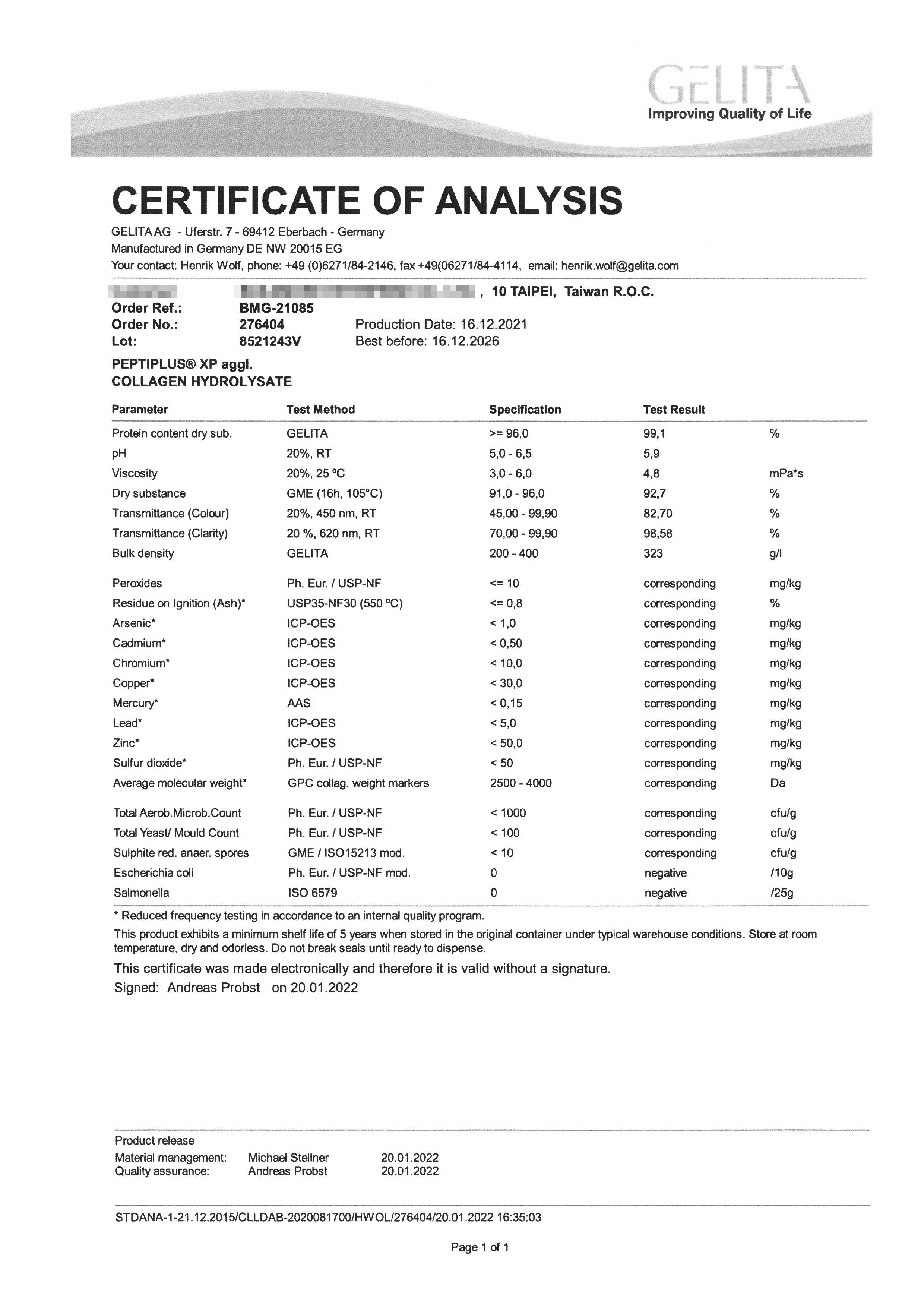 德國水解膠原蛋白粉:原廠檢測報告-8521243V (2022年5月28日)