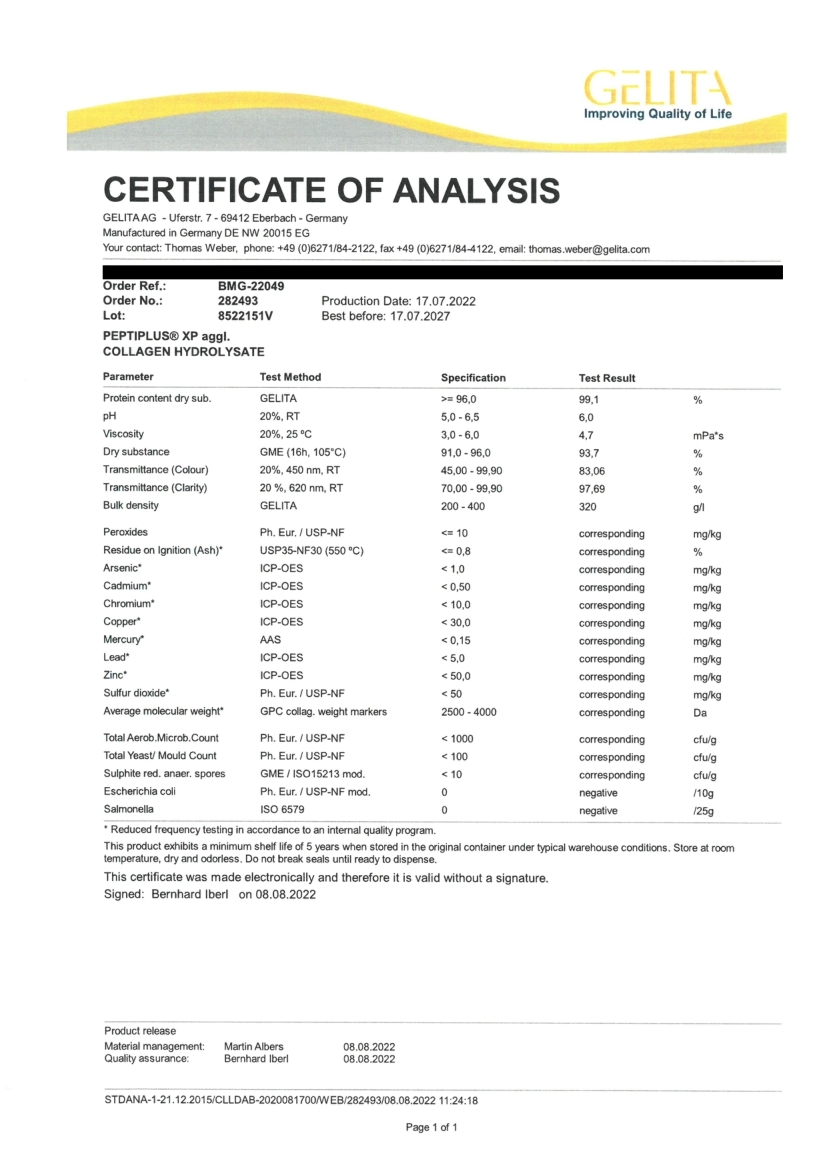 德國水解膠原蛋白粉:原廠檢測報告-8522151V (2023年1月31日)