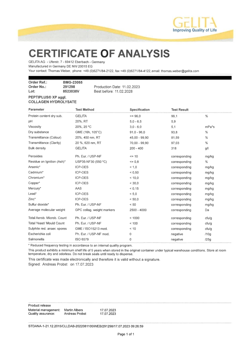 德國水解膠原蛋白粉:原廠檢測報告-8523038V (2023年12月15日)