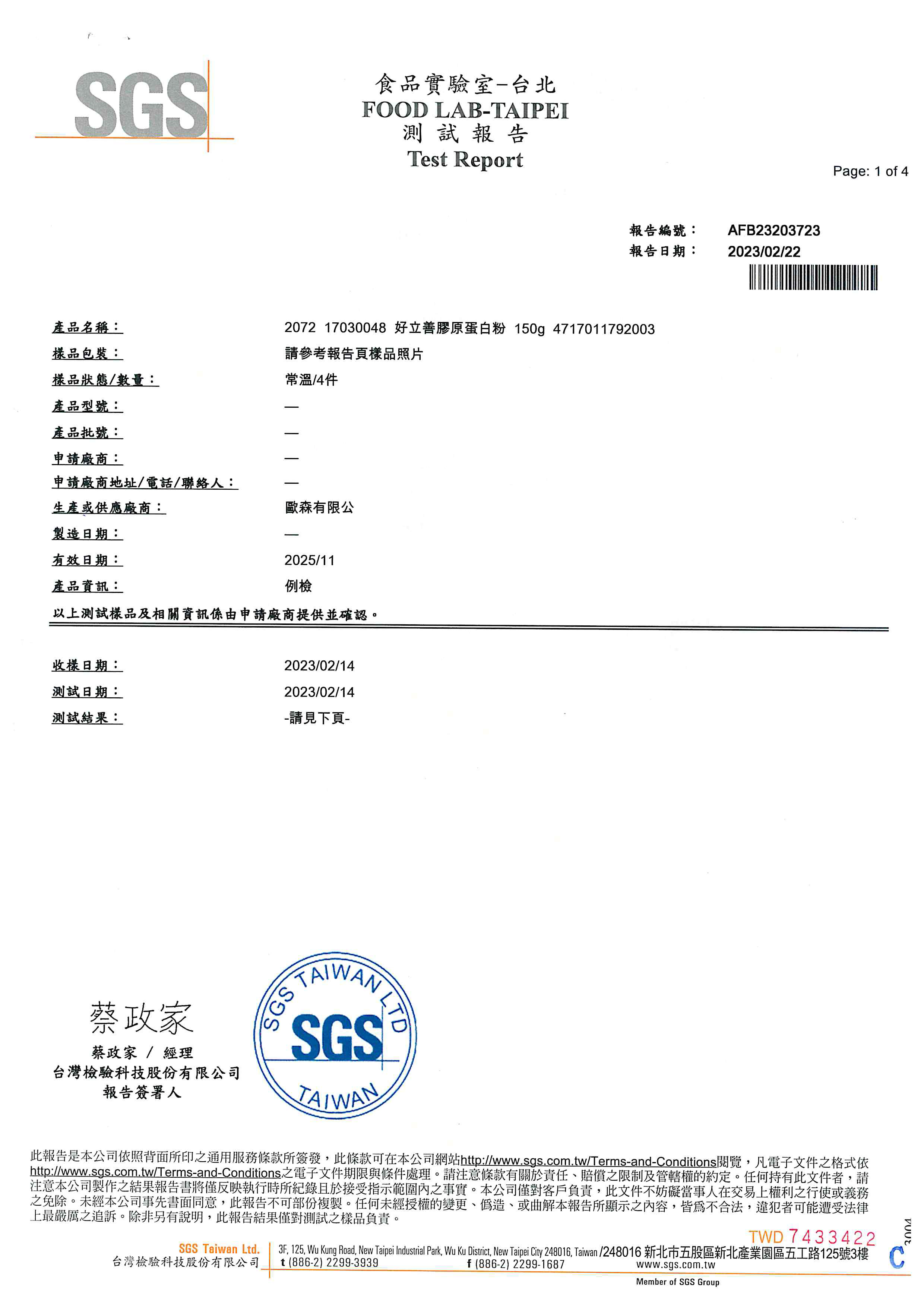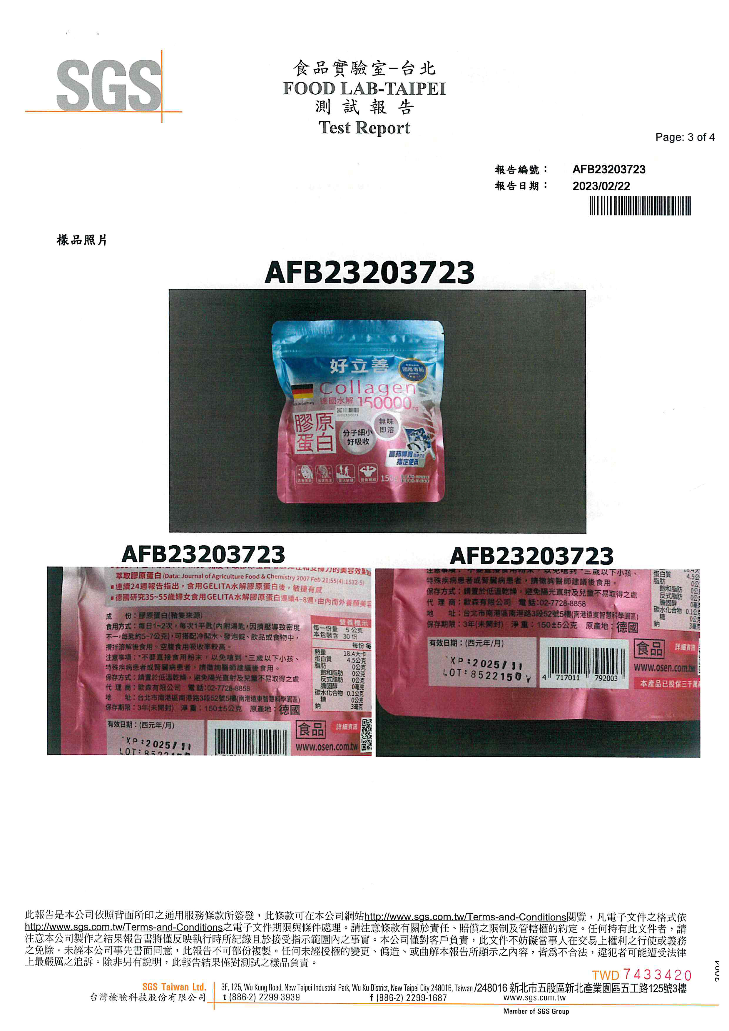 德國水解膠原蛋白粉:SGS食品檢驗報告 (2023年2月22日)