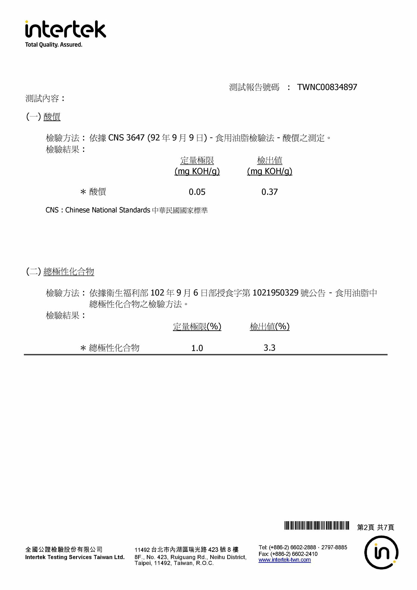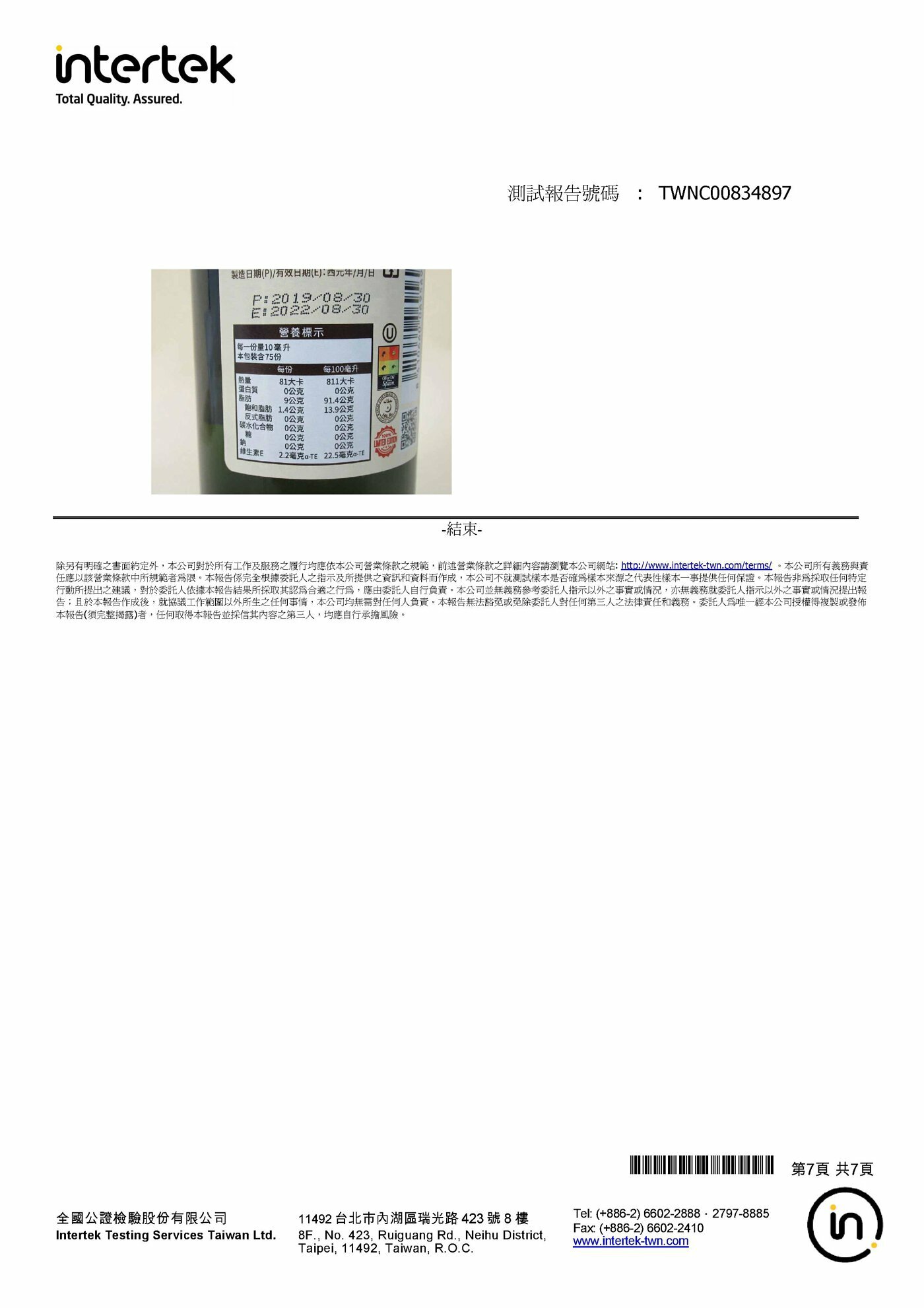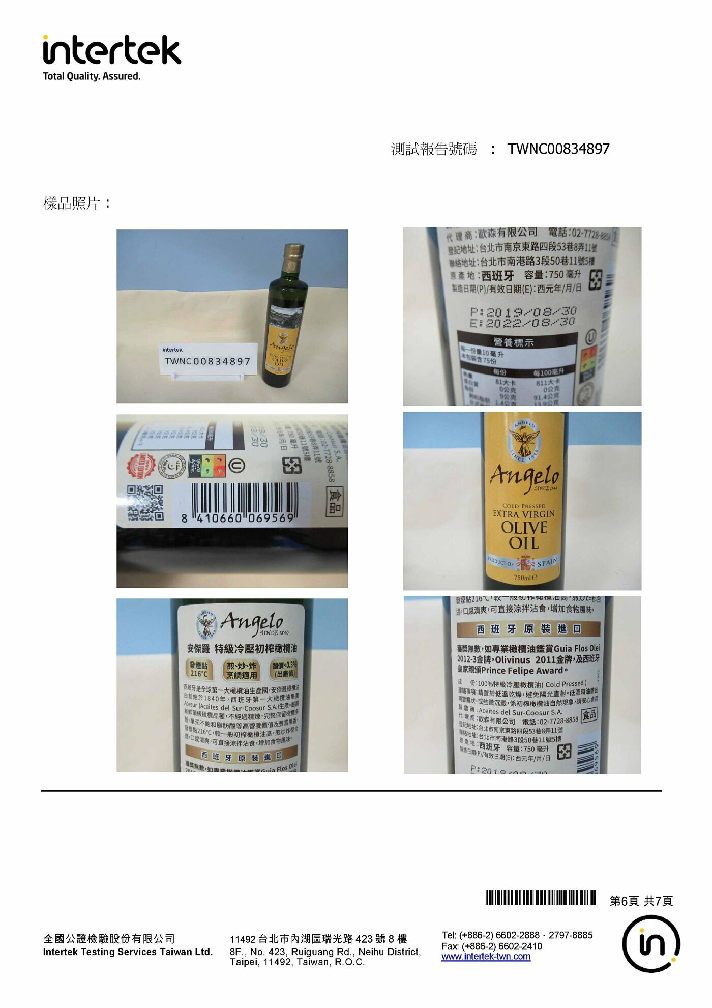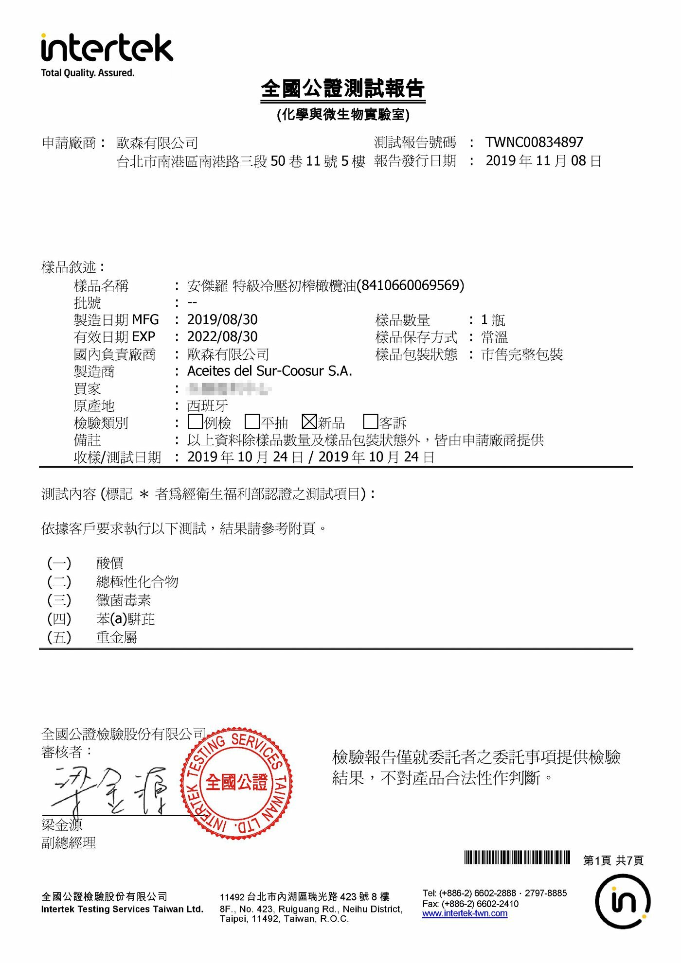 特級冷壓初榨橄欖油:全國公證檢驗報告(2019年11月08日)