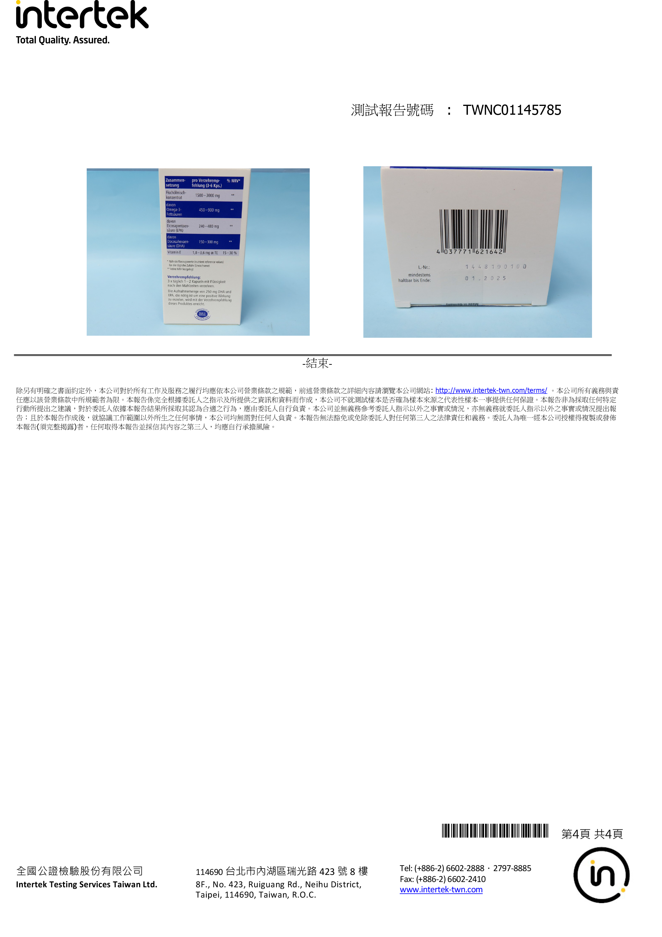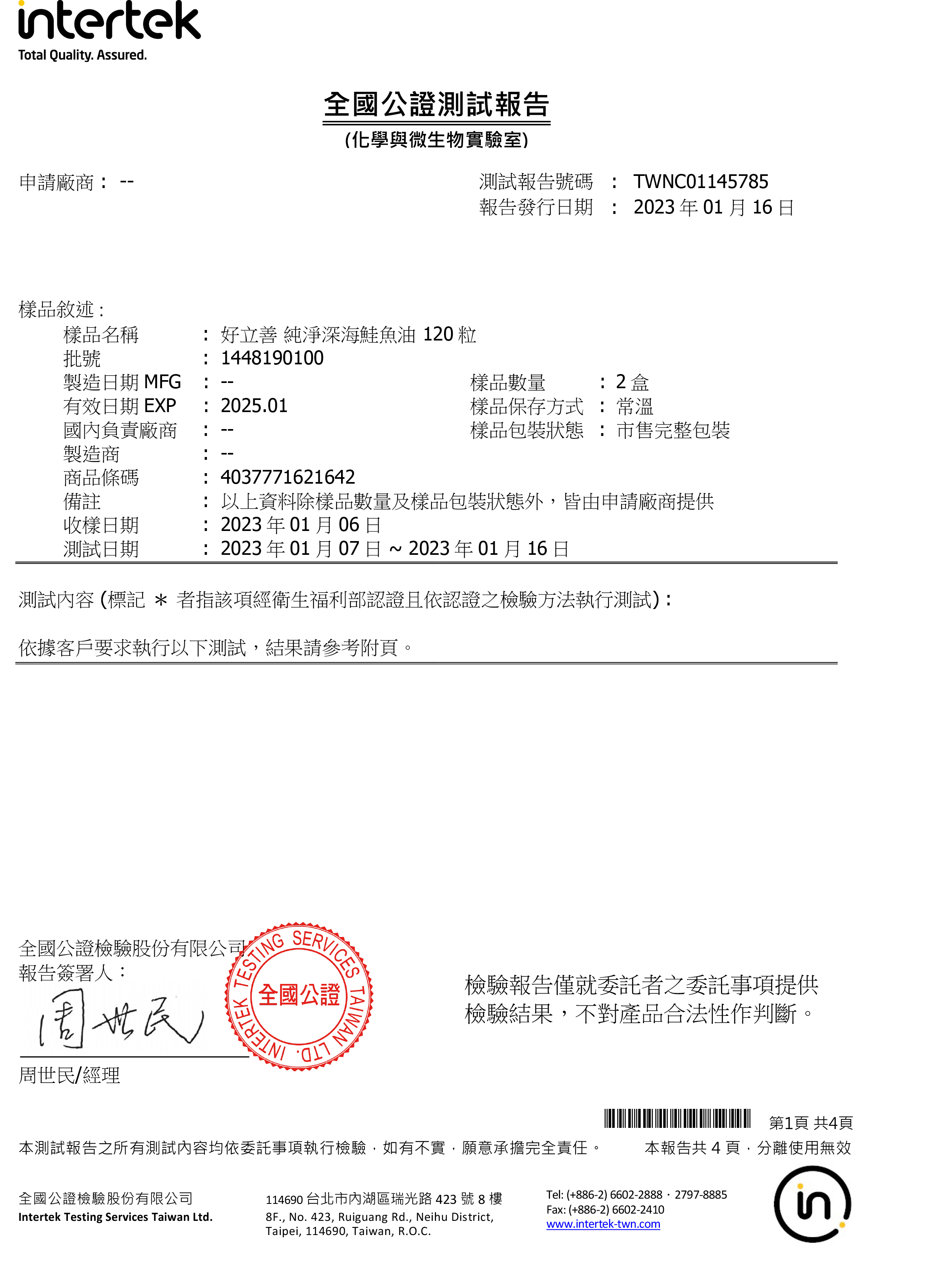 純淨深海鮭魚油:全國公證檢驗報告(2023年1月16日)