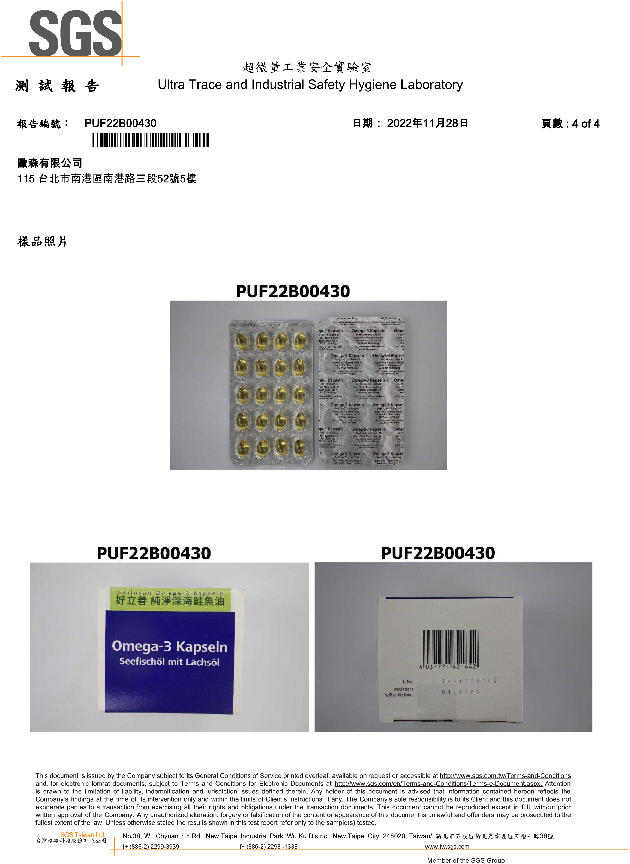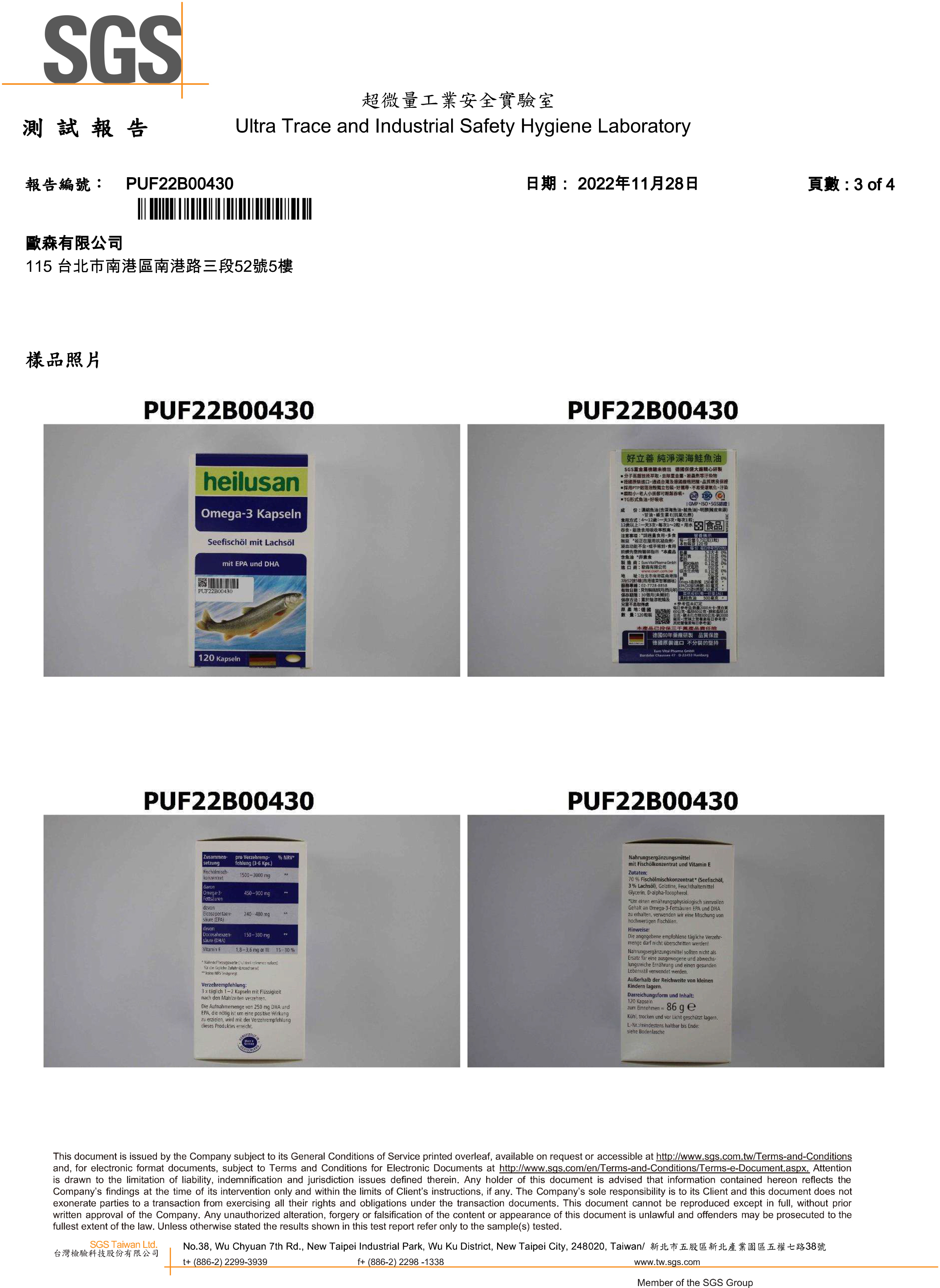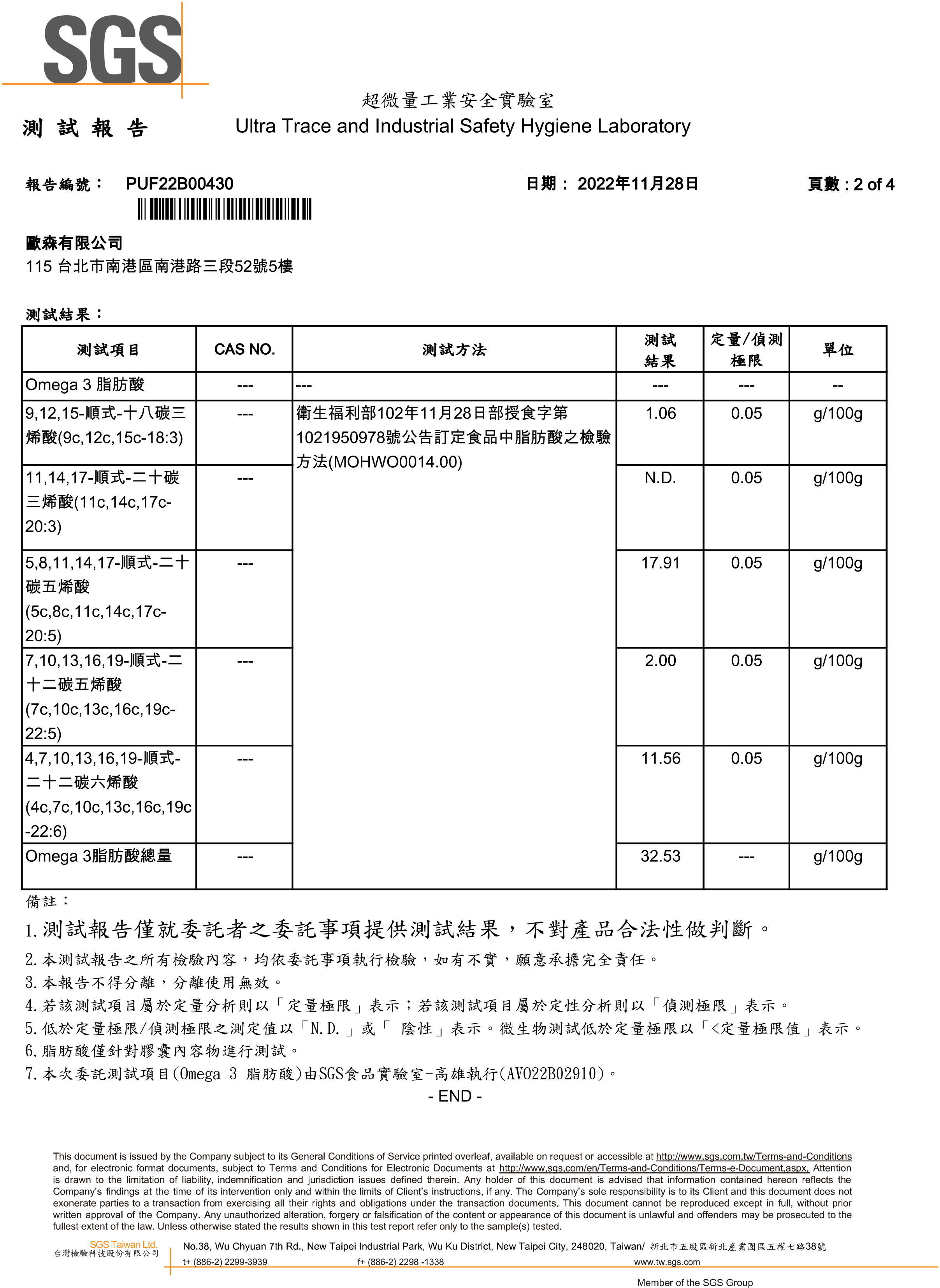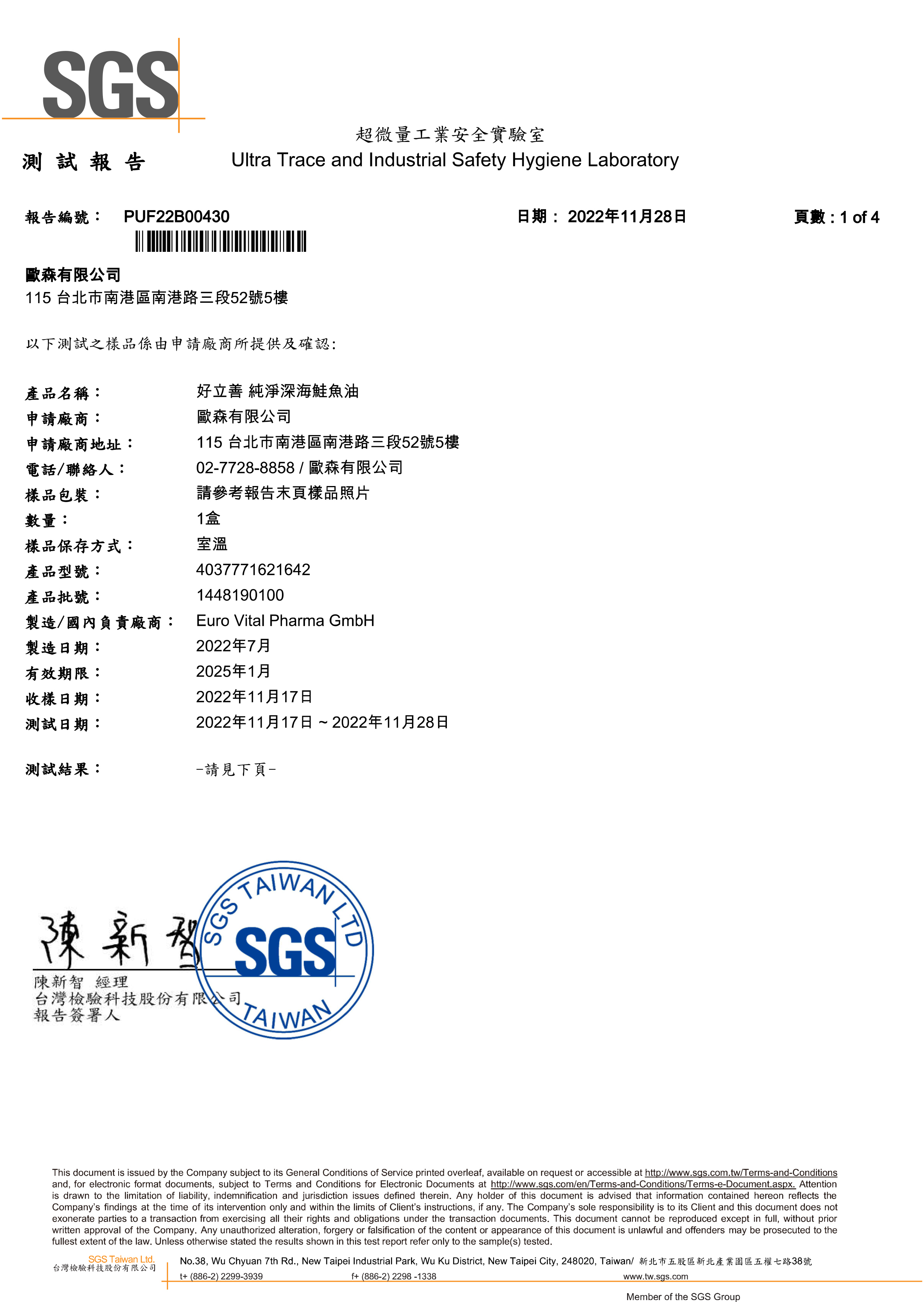 純淨深海鮭魚油:SGS檢驗報告(2022年11月28日)