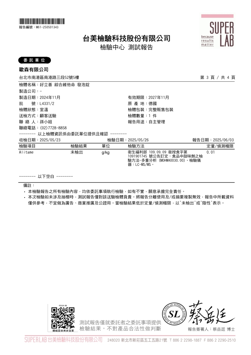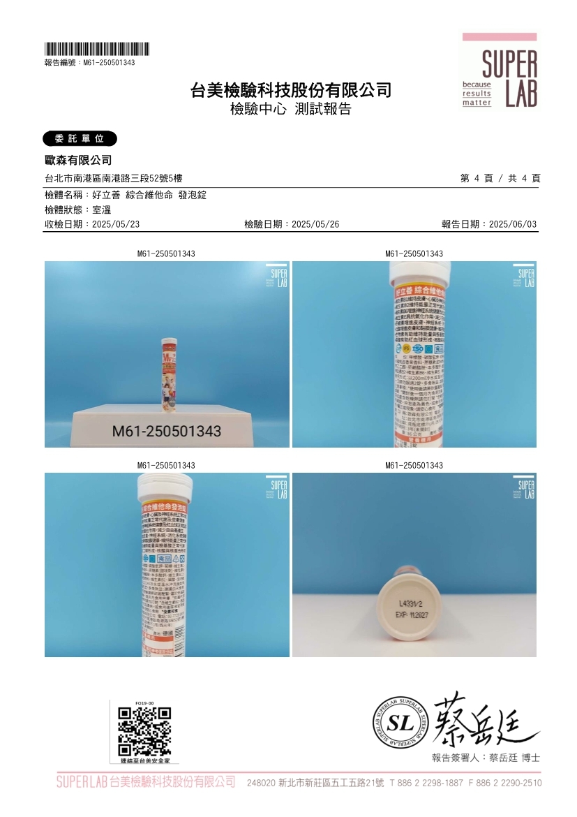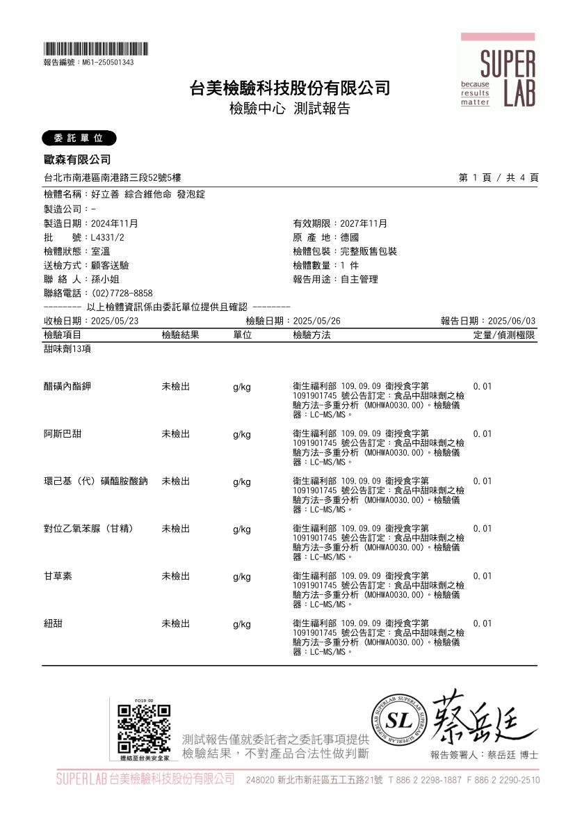 綜合維他命發泡錠(蜜桃百香果口味)台美檢驗報告(2025年6月3日)