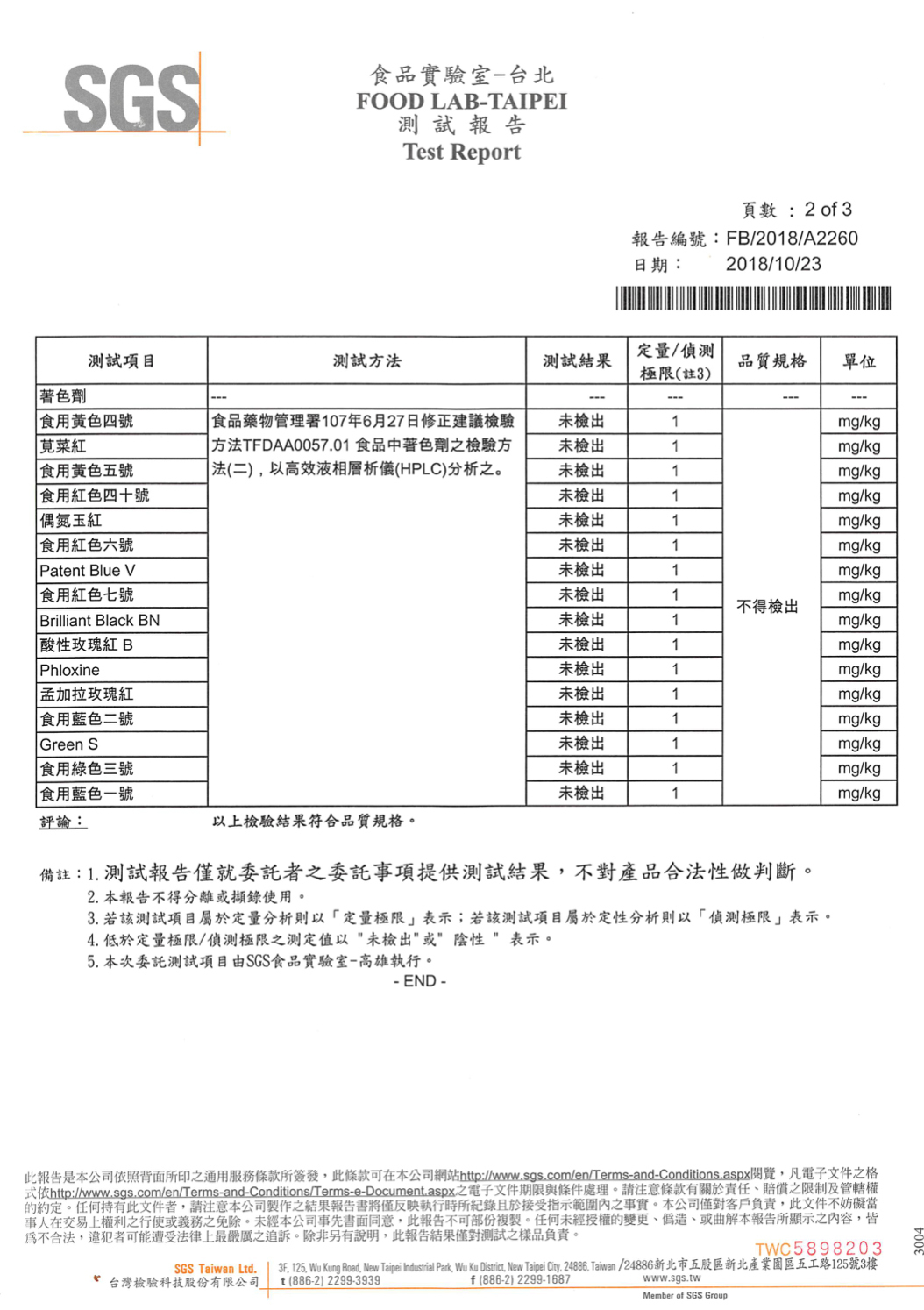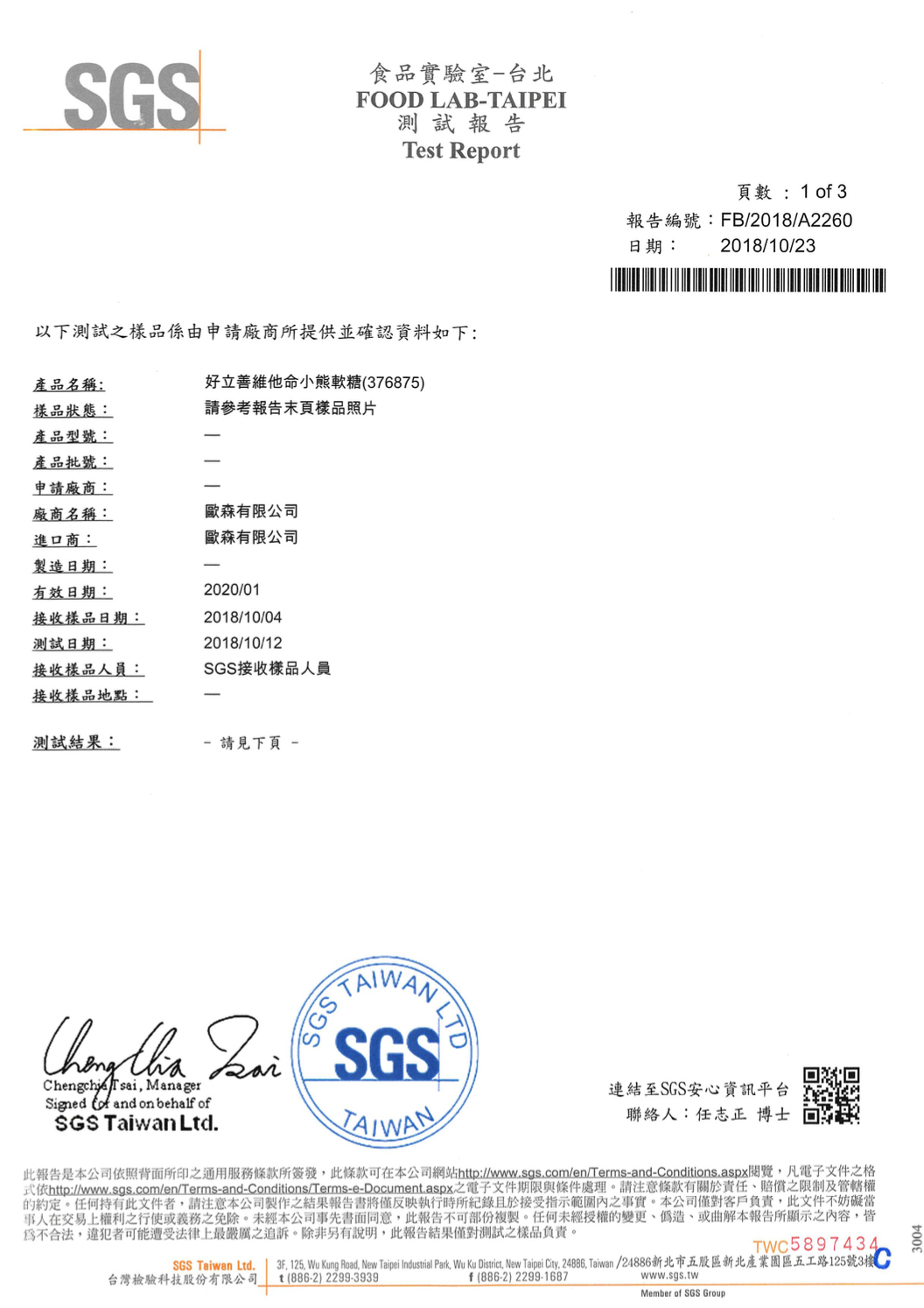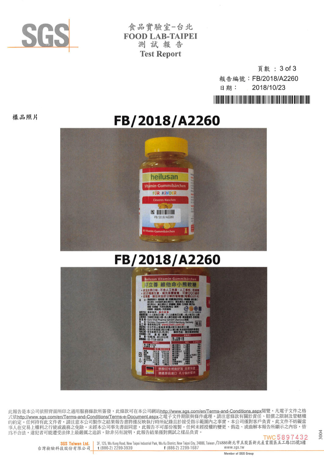 維他命小熊軟糖SGS檢驗報告(2018年10月23日)