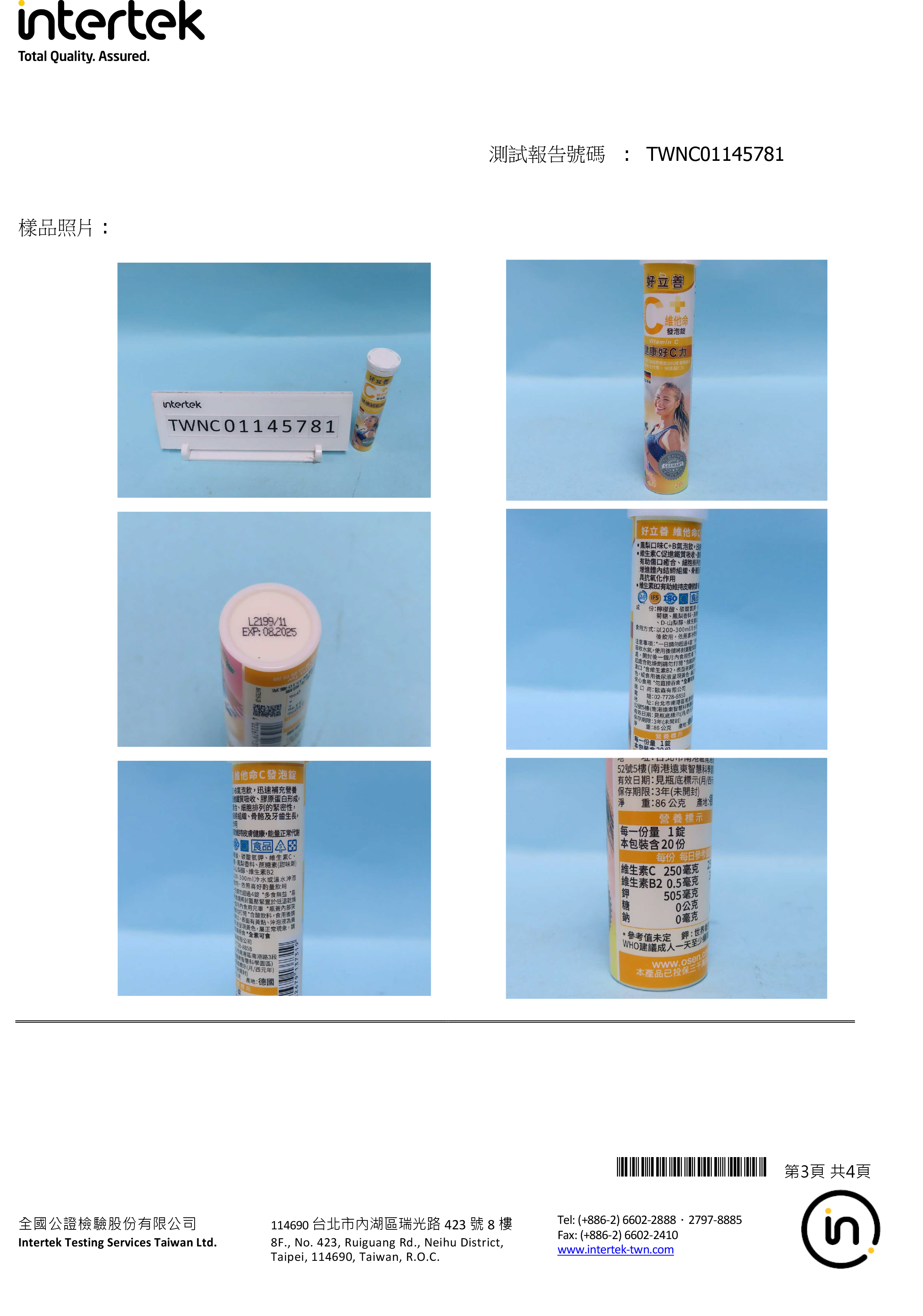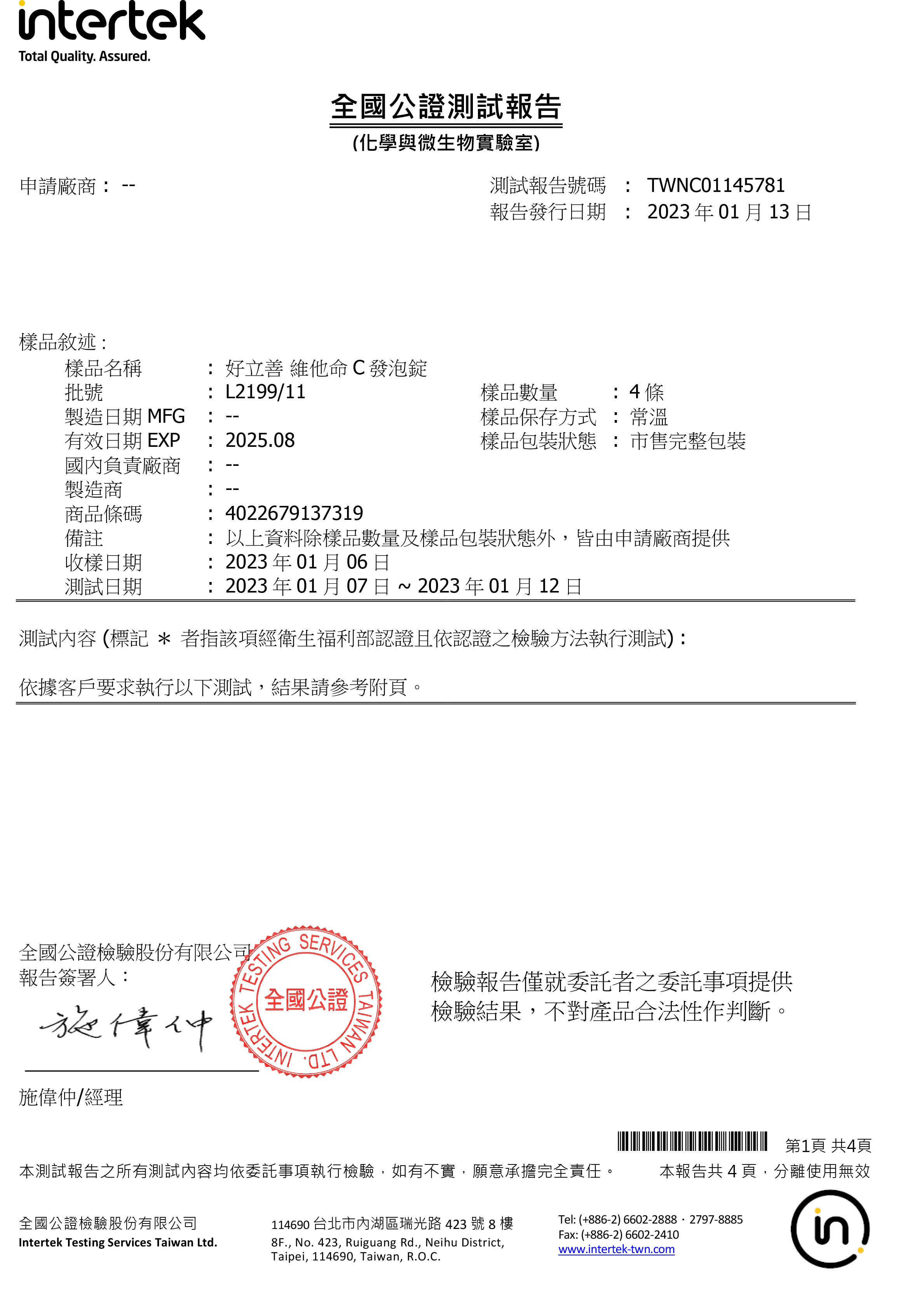 維他命C250發泡錠(鳳梨口味)全國公證檢驗報告(2023年1月13日)