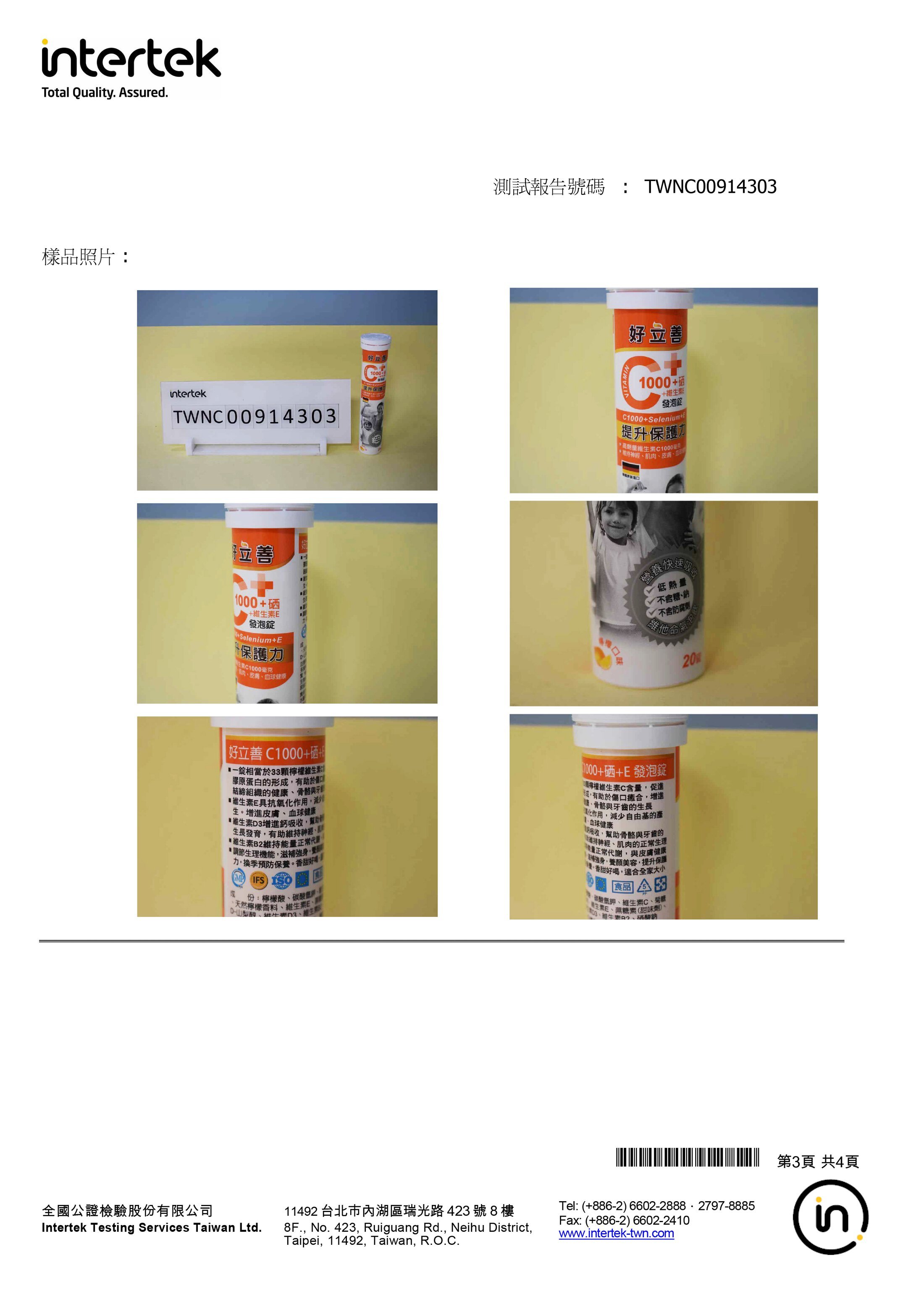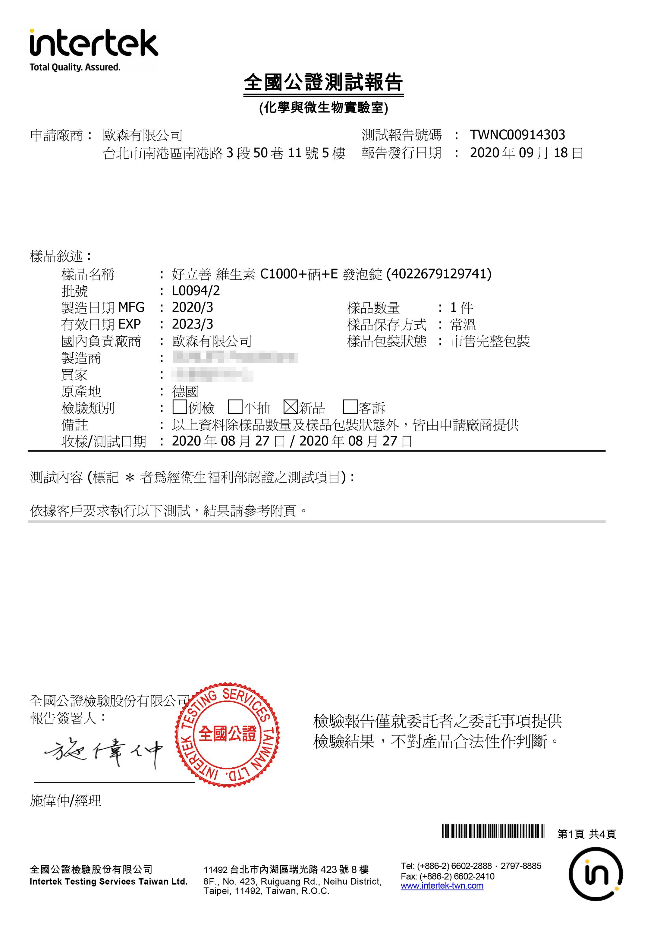 維生素C1000++E發泡錠:全國公證檢驗報告(2020年09月18日)