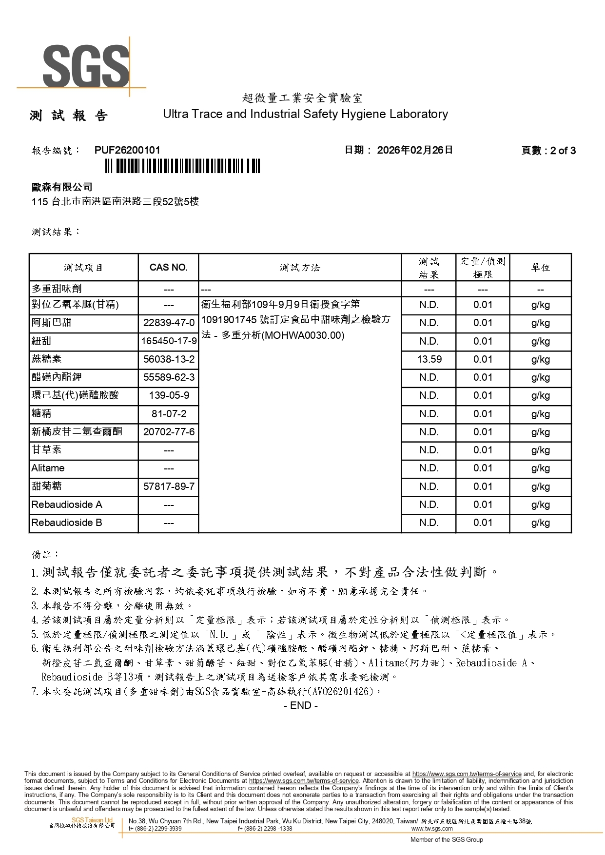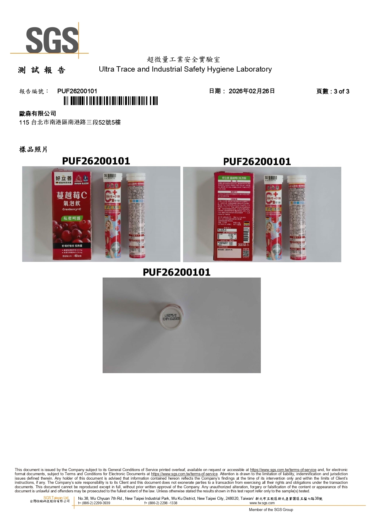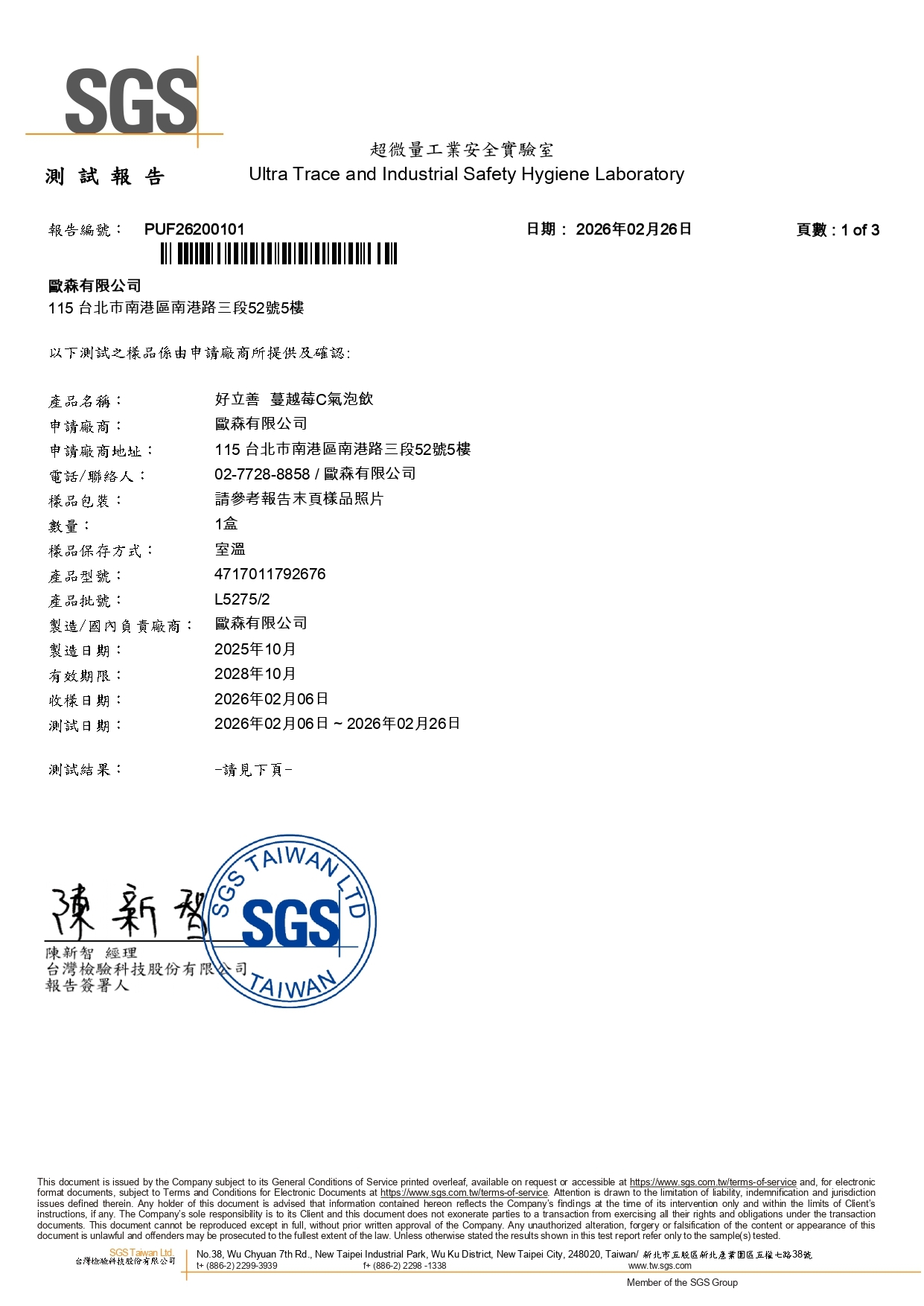 蔓越莓C氣泡飲:SGS檢驗報告(2026年02月26日)