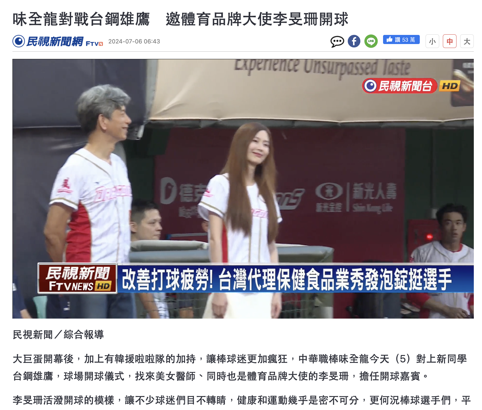 7月5日,在台北市立天母棒球場,歐森好立善將再次展現對台灣運動的承諾,由品牌大使李旻珊醫師擔任中華職棒味全龍的開球嘉賓,為比賽揭開序幕。