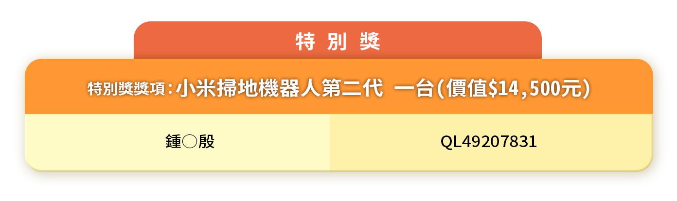 ◎特別獎:小米掃地機器人第二代 一台(價值$14,500)