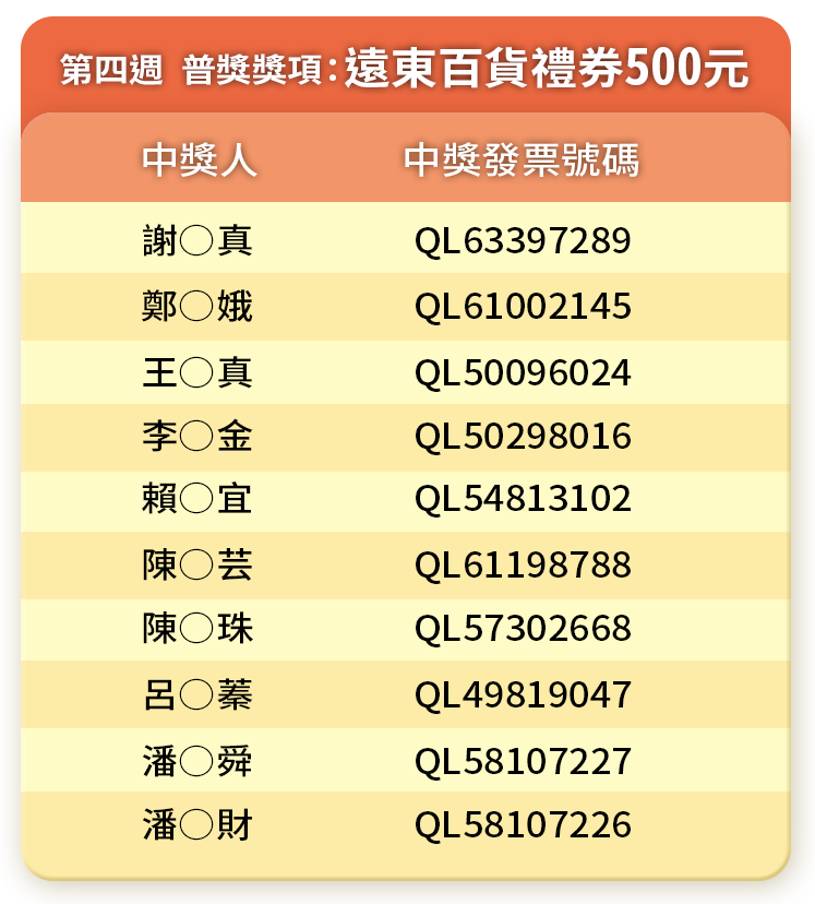4. 請保留中獎發票正本及購買明細以供查驗,所有領獎憑證(包括中獎發票及得獎者資料)須經主辦單位檢核並以主辦單位審核為準;若中獎發票錯誤與系統登錄不符,或任何不完整、損毀、偽造、經改動、變造、複製的領獎憑證均視為無效,主辦單位有權取消相關領獎資格。中獎者請依照中獎公告說明於指定時間內寄回領獎資料,逾期回覆或是中獎資料提供不全以致無法完成獎品領取、寄送者,視同放棄中獎權利。