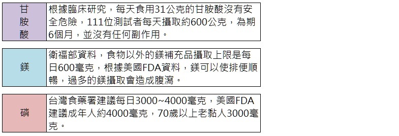 每一滿茶匙約4公克,裡面含有甘胺酸3公克、鎂205毫克、磷179毫克,如果攝取略多,例如滿匙的高度較高些,對於正常人較不會造成健康問題。