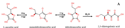 維生素C(Ascorbic Acid)具有抗氧化作用,透過「犧牲自己」來減緩或防止生物體產生氧化作用,用來保護細胞膜、蛋白質、去氧核醣核酸等,免受自由基的破壞。很容易受到光線、溫度、酸鹼度和空氣中的氧化物被所影響(註1),釋放出「電子」和「質子」,轉變成脫氫抗壞血酸(dehydroascorbic acid),如近一步水解會產生不具活性的2,3-二酮古洛糖酸(2,3-diketogulonic acid)。
